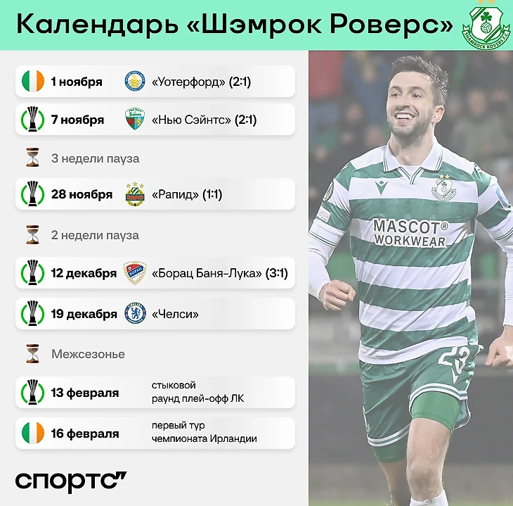 И да, формально у «Шэмрока» будет межсезонье – с 19 декабря по середину февраля. Но оно будет на полтора месяца короче, чем у конкурентов.