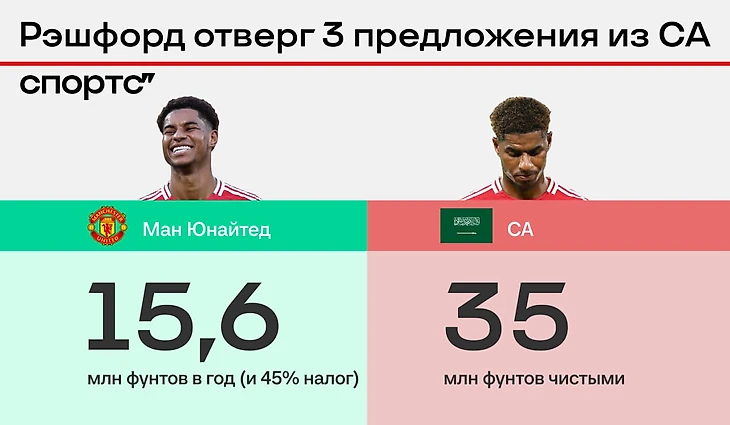 В The Times сообщили, что Рэшфорд отклонил сразу три предложения от саудовских клубов. Один из них предполагал повышение зарплаты в два с лишним раза – до 35 млн фунтов в год. Маркусу даже не пришлось бы платить подоходный налог в Саудовской Аравии, в то время как в Великобритании он находится в верхней налоговой категории и отдает государству 45% зарплаты. В «МЮ» он получает 300 тысяч фунтов в неделю – это 15,6 млн в год грязными (цифры Capology). В Саудовской Аравии предлагали 675 тысяч фунтов в неделю.