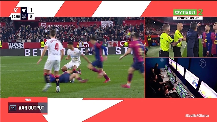 Яркий момент еще случился на 54-й минуте, при 2:1. Соу упал в штрафной «Барселоны» после того, как Жюль Кунде коснулся его спины. Судья проигнорировал, хотя игроки «Севильи» требовали пенальти