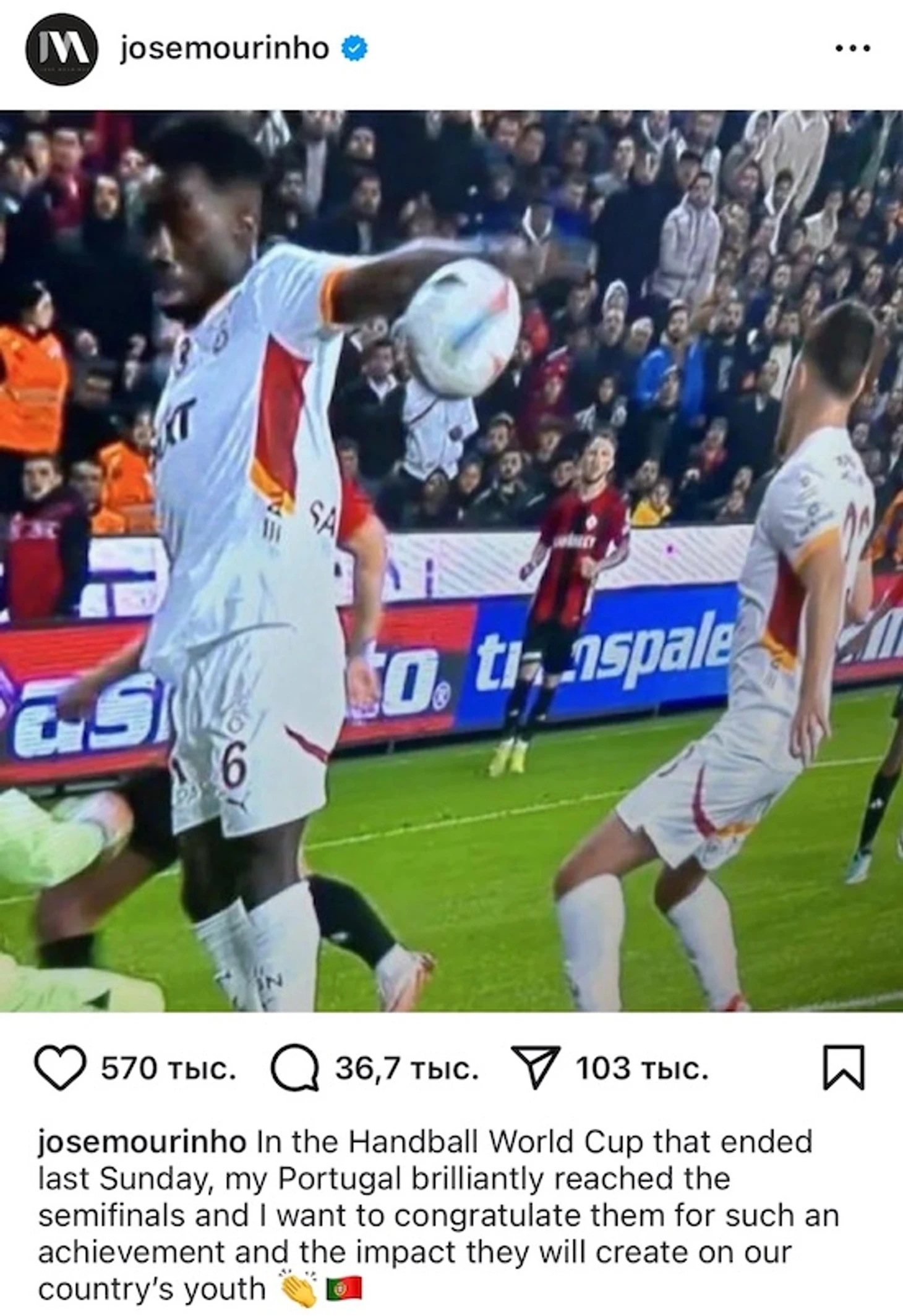 В начале февраля Моуринью поздравил в соцсетях Португалию с выходом в полуфинал ЧМ по гандболу. Все бы ничего, но тренер попутно уколол главного соперника, сопроводив пост фотографией, на которой мяч попадает в руку защитника «Галатасарая».