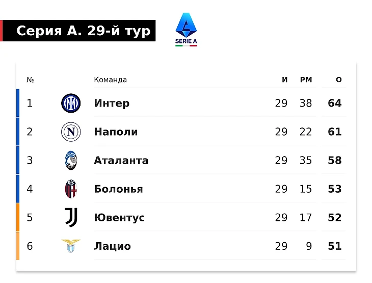 «Интер» оторвался от «Наполи» на три очка, «Аталанта» пока в топ-3. «Ювентус» выпал из зоны Лиги чемпионов на фоне победной серии от «Болоньи».