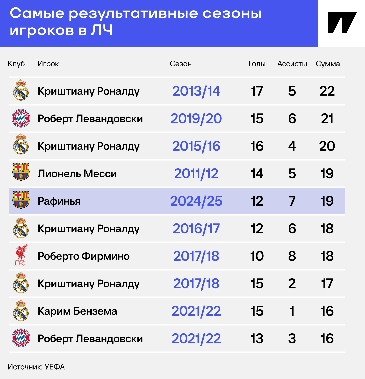⭐️ Король ЛЧ – конечно, Криштиану Роналду. Португалец выдал рекордный сезон-2013/14: аж 17 голов и пять ассистов в «Реале». А затем еще трижды попал в список лучших, когда «Мадрид» забирал одну ЛЧ за другой. Но Рафинья способен обойти даже Криштиану: дальше еще ответный матч с «Дортмундом» и, скорее всего, полуфиналы.