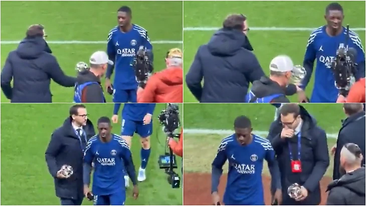 Уходившего с поля Дембеле сняли с трибун. Сотрудник УЕФА протянул ему приз лучшему игроку матча, но француз скривился – и даже не остановился.