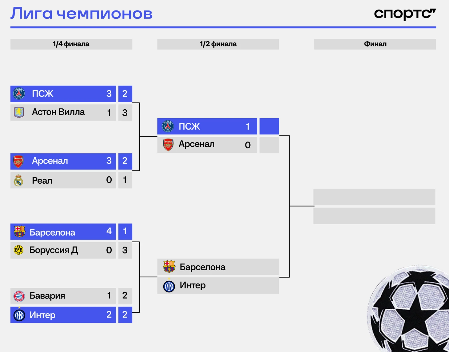 По матчу. Есть ощущение, что Арсенал должен был обороняться 4-4-2 с Эдегором в паре нападающих, но я увидел такую расстановку только в первые 20 минут матча. Дальше Арсенал заставил ПСЖ обороняться практически весь матч. Изначально было интересно сможет ли кто-либо вообще сделать такое с командой Луиса Энрике и как он будет готовить позиционную оборону, если заставят. Арсенал ответил: только количественно. В этом матче получилось из-за невероятно работоспособного центра поля (Жоао Невеш так вообще везде). Если добавить к этому, что ПСЖ и к стандартам особо не готовится, то странно не спрашивать с Энрике за это. Атака ПСЖ очень талантливая, способная на многое и на пространстве и внутри штрафной, но если лишить их мяча, то она отрезается от всех остальных. Это было сильно видно с 20 минуты до конца первого тайма. А если Арсенал смог лишить их мяча, то Барселона (верю в нее больше) подавно. Поэтому как нейтральный болельщик предпочел бы увидеть именно Арсенал. Он хорошо забрал мяч, было много интересных и потенциально голевых подходов, разнообразные атаки, но сказывается проблемы с травмами. В оптимальном составе отыгрались бы, думаю.