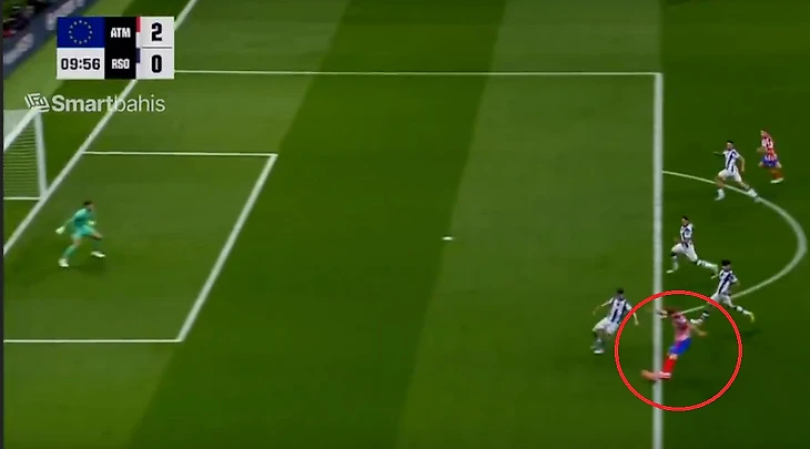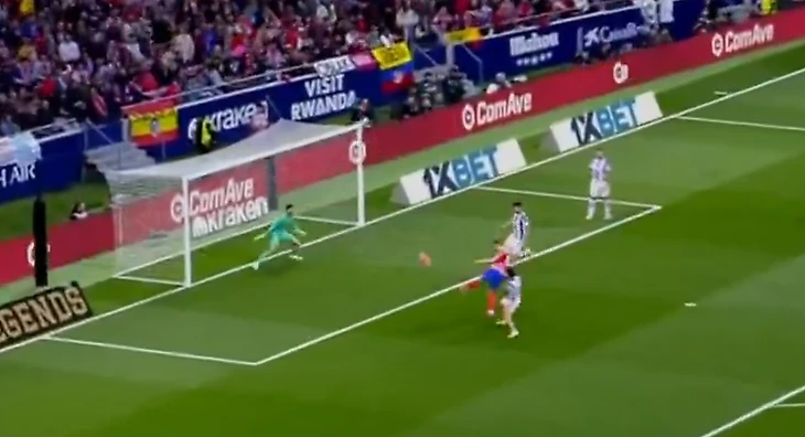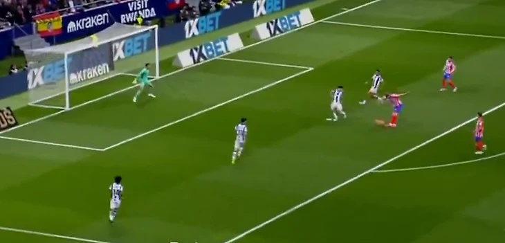 Еще через минуту Серлот использовал рикошет от защитника «Сосьедада»: один выбил в другого, мяч отскочил к форварду «Атлетико», он мощно и сразу пробил.