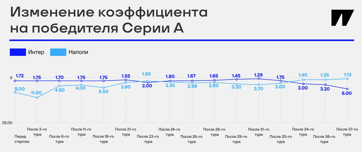 Еще за семь туров до конца в «Интер» верили серьезно: давали 78%, запас перед «Наполи» был трехочковым, неаполитанцам давали лишь 27%. Это был еще не самый минимум по сезону: например, 18% было в конце первого круга, а 9% – после трех туров, «Наполи» стартовал с 0:3 от «Вероны».