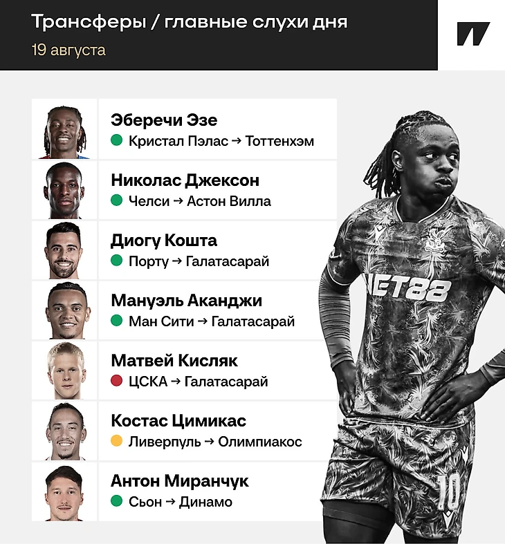 Комментарий Вадима Лукомского: «Тоттенхэм» активизировал интерес к Эзе после травмы Джеймса Мэддисона. Не идентичные игроки, но Эзе частично может забрать на себя креативный функционал Мэддисона. В «Пэлас» Эберечи часто действовал с левого фланга со смещениями, но легко может выходить и в центре – все равно регулярно открывается там, вне зависимости от стартовой позиции.