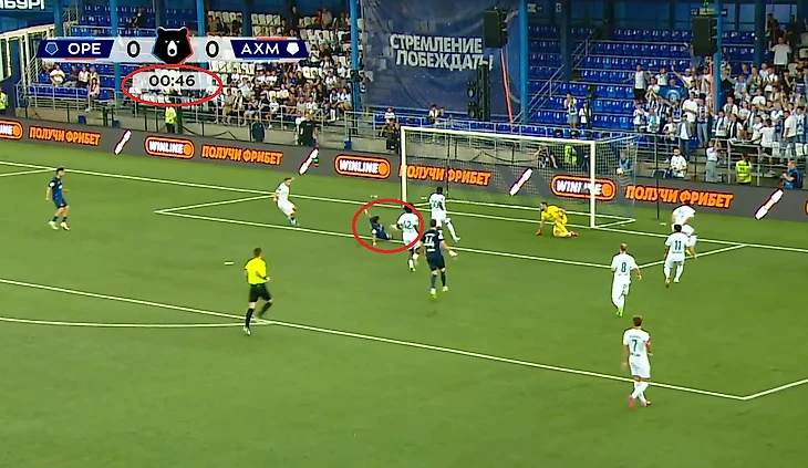 Через три минуты еще и удаление: Эгаш Касинтура въехал ногой в шею Ираклию Квеквескири. Полузащитник «Оренбурга» сыграл головой, а соперник не успел затормозить.
