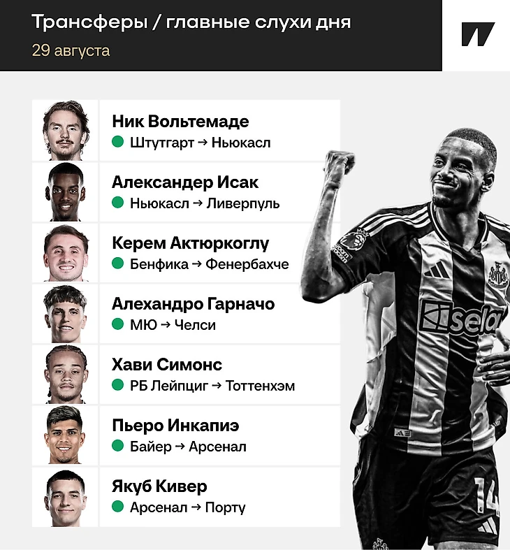 «Челси» давно договорился с Алехандро Гарначо и Хави Симонсом, но трансферы зависели от продаж Кристофера Нкунку и Николаса Джексона. Француза практически подписал «Милан», поэтому Гарначо и Симонс прибыли в Лондон. «Челси» предложил контракт только Гарначо (покупают у «МЮ» за 40 млн фунтов и 10% от перепродажи), а вот Симонса перехватил «Тоттенхэм» (дали «Лейпцигу» 60 млн евро).