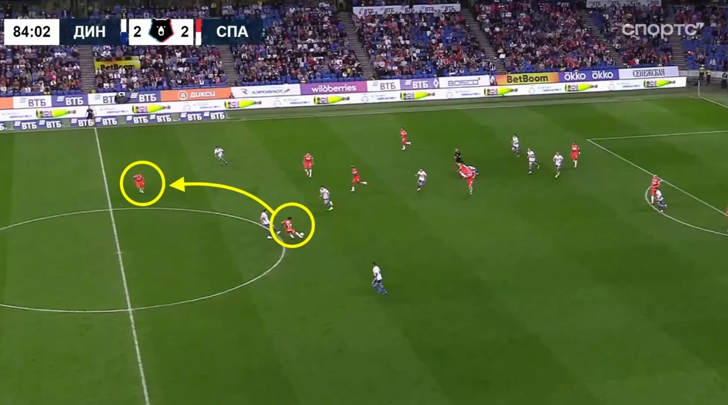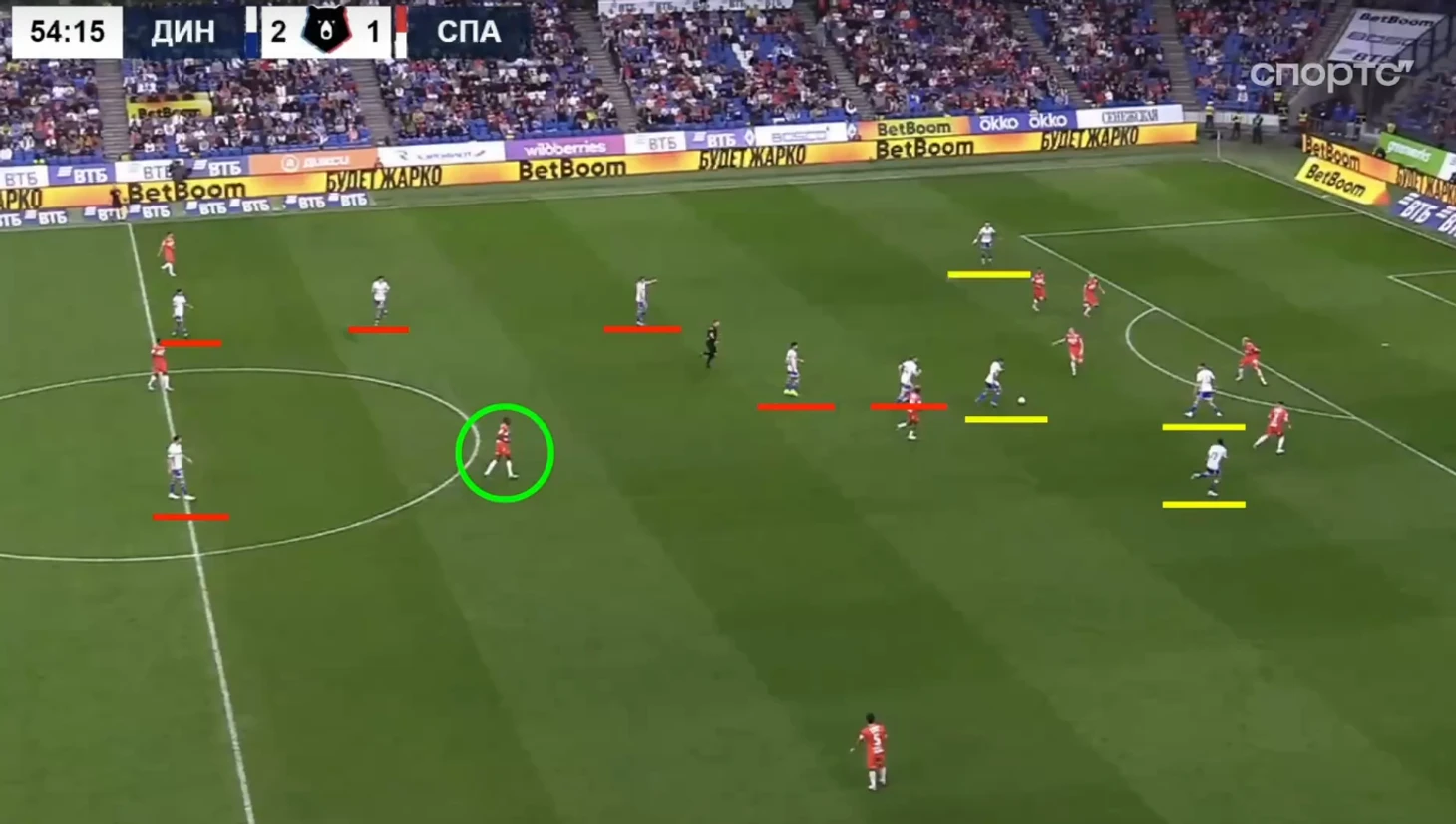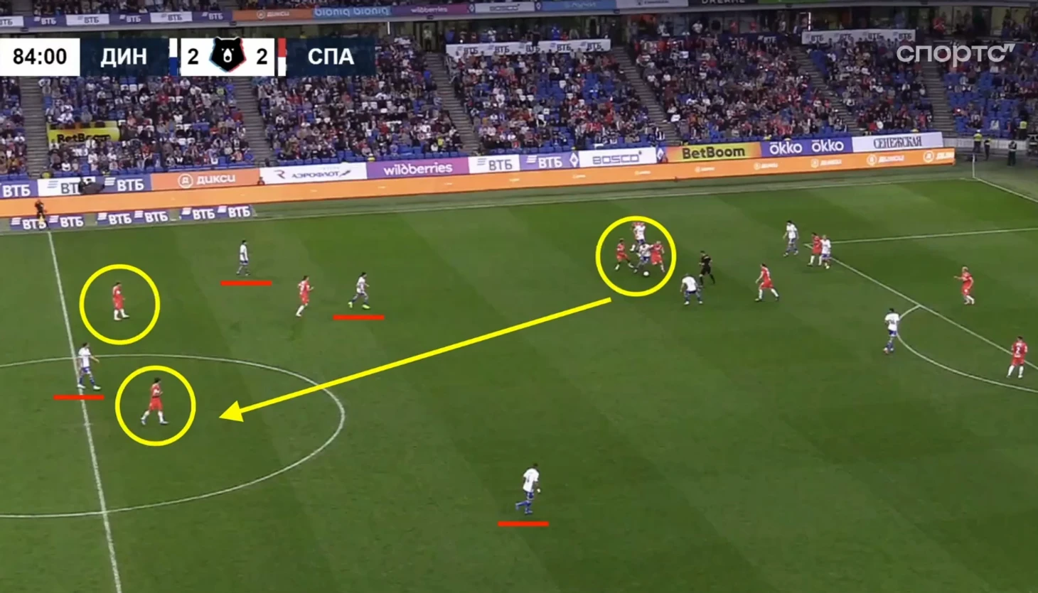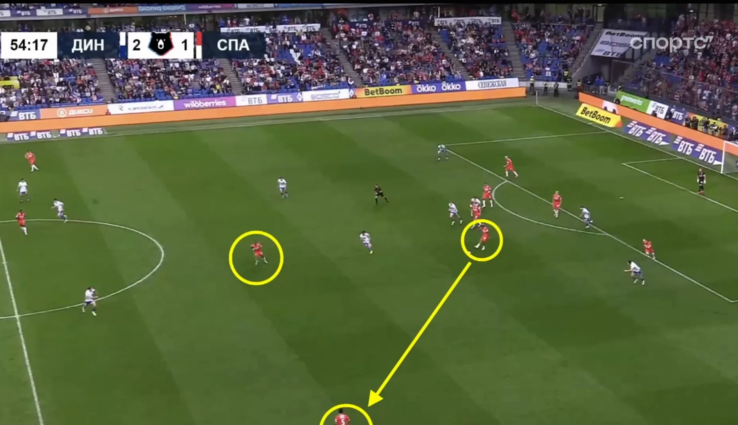 Если бы «Динамо» было хорошо расположено, они могли бы вступить в быстрый отбор. Сейчас не было шансов контрпрессинговать, потому что игроки, которые не участвовали в атаке, были не в тех позициях. «Спартак» опять вываливается в очень хорошую атаку – сколько пространства.