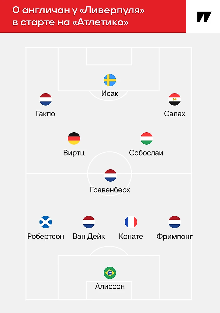 Весь состав на домашний топ-матч – из легионеров, обратила внимание Opta. Обычно отдувается Кертис Джонс, но полузащитника нет из-за травмы, должен вскоре восстановиться и хоть чуть скрашивать. Англичан в заявке вообще у них мало, Арне Слот просто выпускает сильнейших.