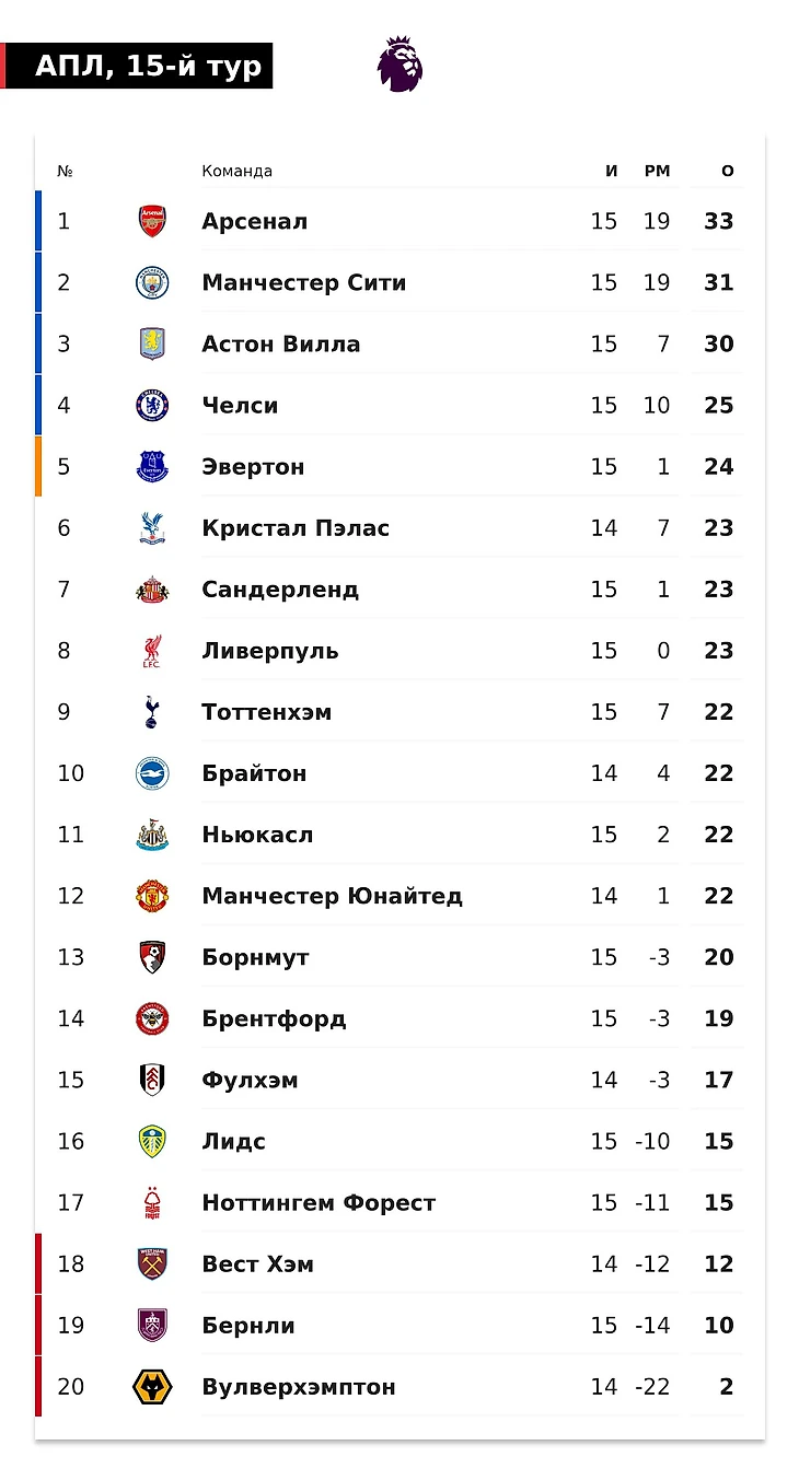 Следующий тур пройдет 13-15 декабря. «Арсенал» встретится на своем поле с «Вулверхэмптоном», «Ливерпуль» – с «Брайтоном», «Челси» – с «Эвертоном», а «МЮ» – с «Борнмутом». У «Ман Сити» – гостевая игра против «Кристал Пэлас», у «Астон Виллы» – против «Вест Хэма», а у «Тоттенхэма» – против «Ноттингем Форест».