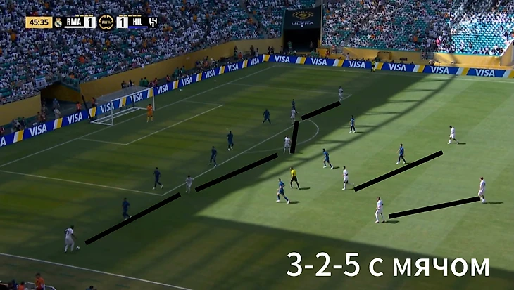 Ответ стал ясен с первых минут: в атакующей фазе «Реал» выстраивался по схеме 3-2-5 — типичное решение для позиционного доминирования. Линия из трёх центральных защитников и два полузащитника (Вальверде + Тчуамени) обеспечивали контроль и ширину при розыгрыше. В зоне «между линий» работали Беллингем и Родриго, при этом Трент Александер-Арнолд периодически поднимался в полуфланг, добавляя вариативности. Винисиус действовал на левом фланге, а на позиции центра форварда — Гонсало Гарсия.
