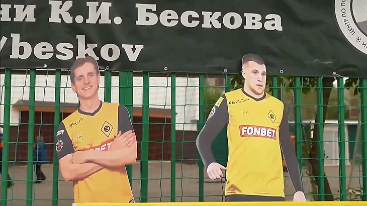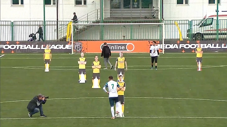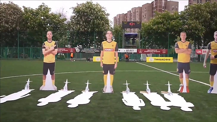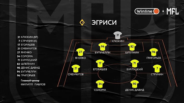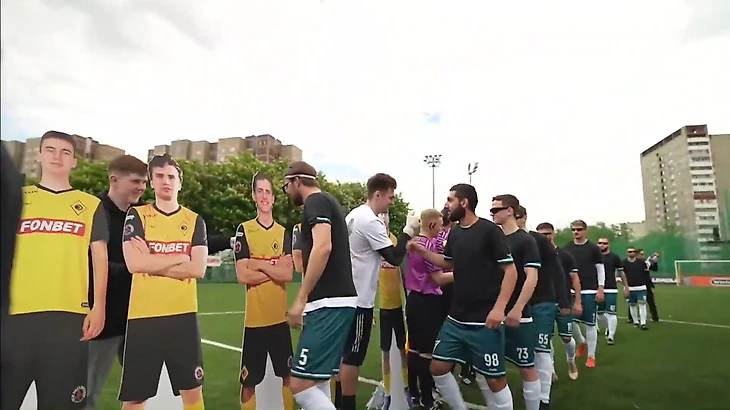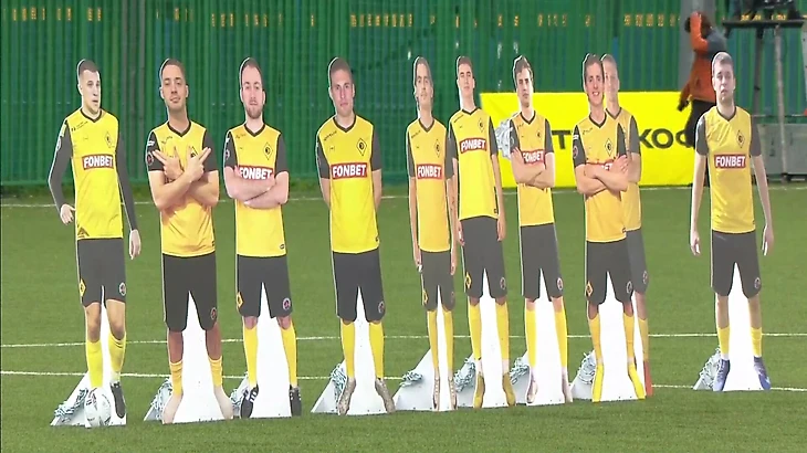 Минут за пять до старта матча Паша Чепурин (игрок «Эгриси» и комментатор МФЛ) расставил на поле 10 картонных футболистов в желто-черной форме. Настоящих игроков не видно.