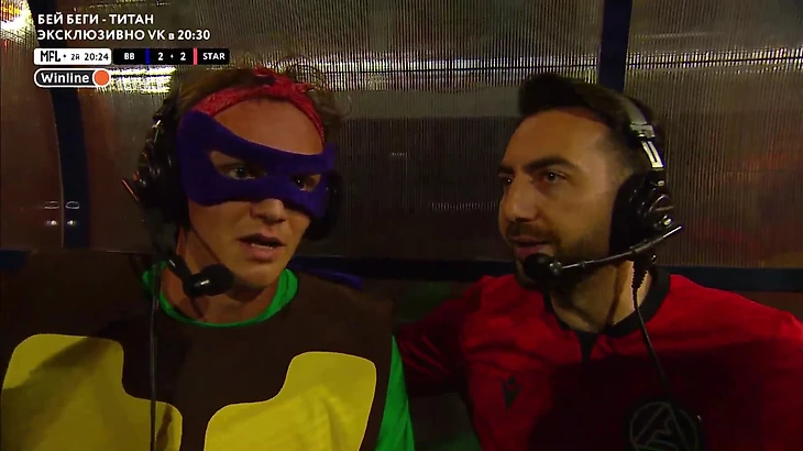 После замены на интервью к Карену Адамяну заглянул Александр Ткачук в костюме Донателло. Разговор поддержал атмосферу безумия.