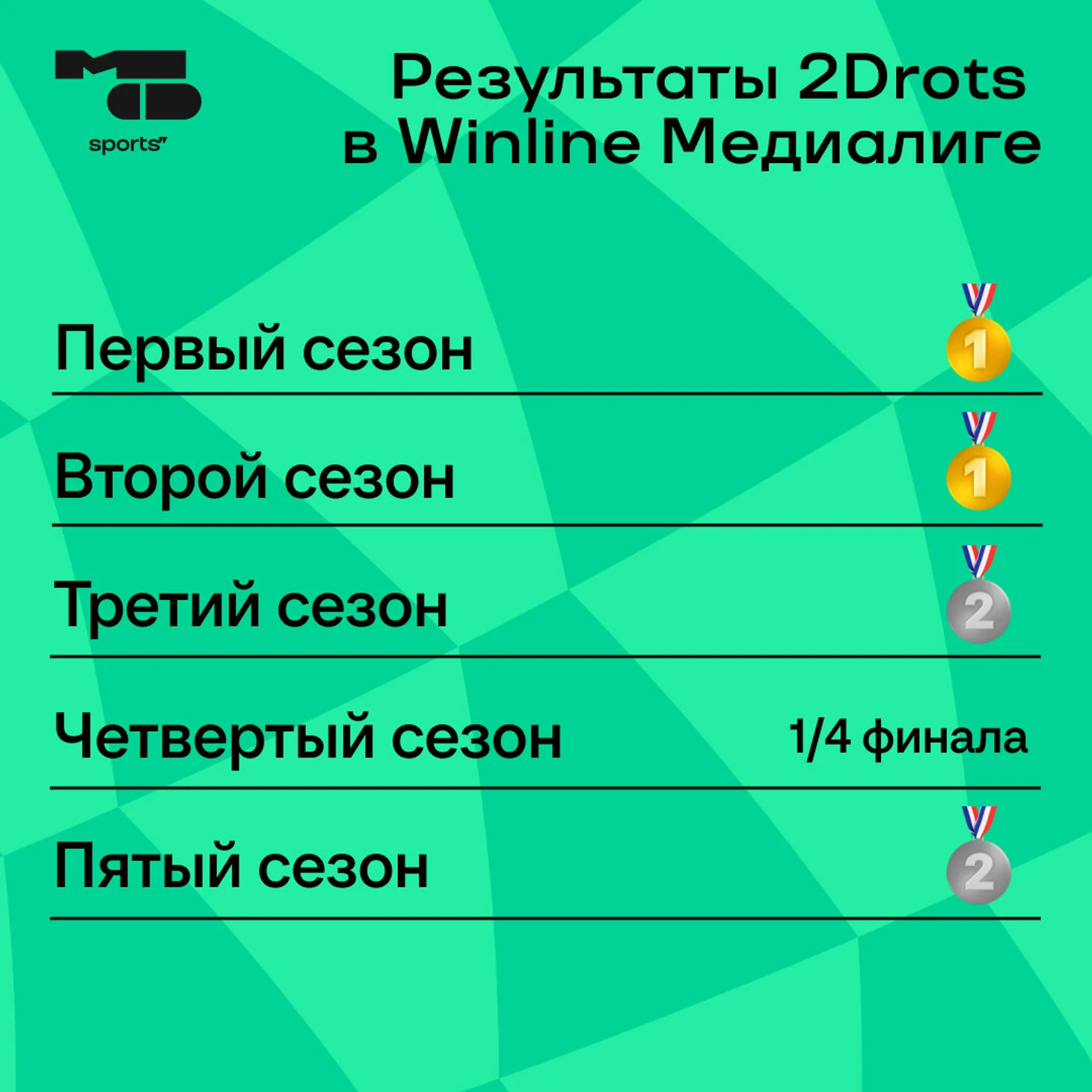 ● 2Drots выиграли два первых сезона Медиалиги. Но дальше – без побед. В финале МФЛ-3 проиграли «Родине Медиа», в МФЛ-4 срезались против «Эгриси» в 1/4 финала, в МФЛ-5 – проиграли в финале.