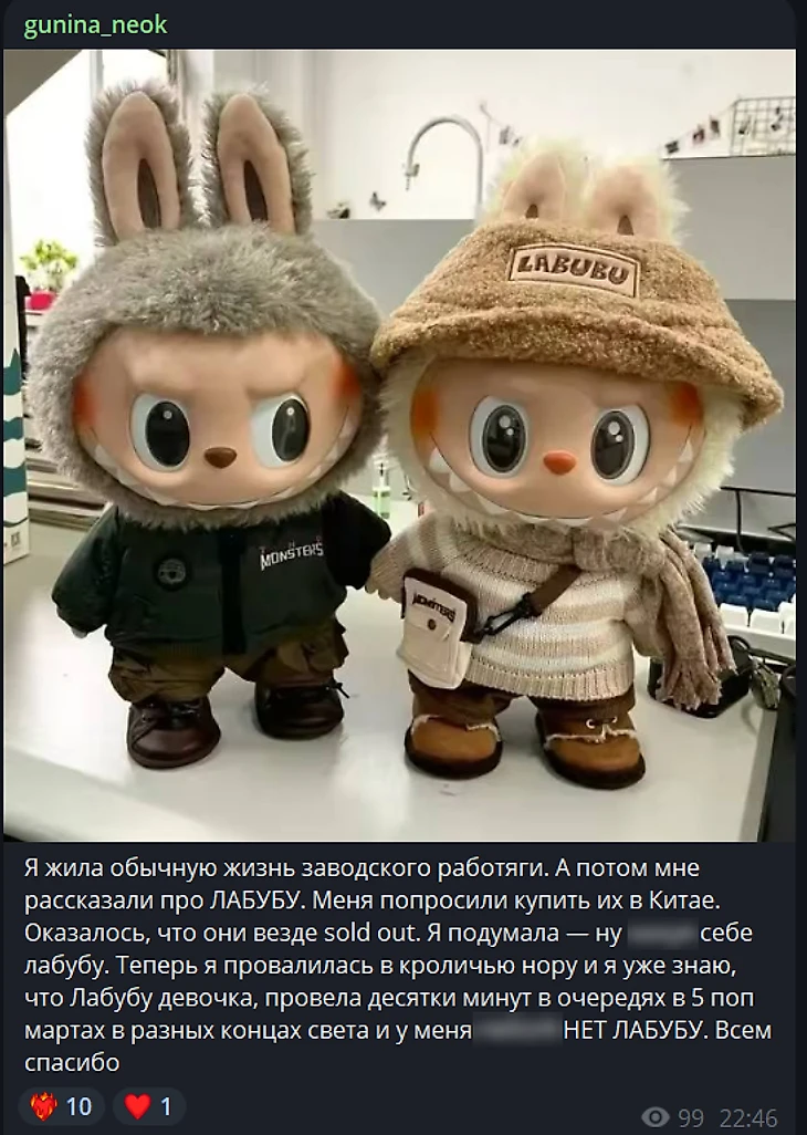 ● Хаотичные релизы и лимитированные серии. Непонятно, когда запустят новую коллекцию, и люди быстро их раскупают – боятся, что завтра игрушек уже не будет. Владельцы оригинальных игрушек обходятся с ними максимально бережно. В соцсетях полно роликов, как игрушку Лабубу водят за ручку, устанавливают брекеты, делают пирсинг, кормят.