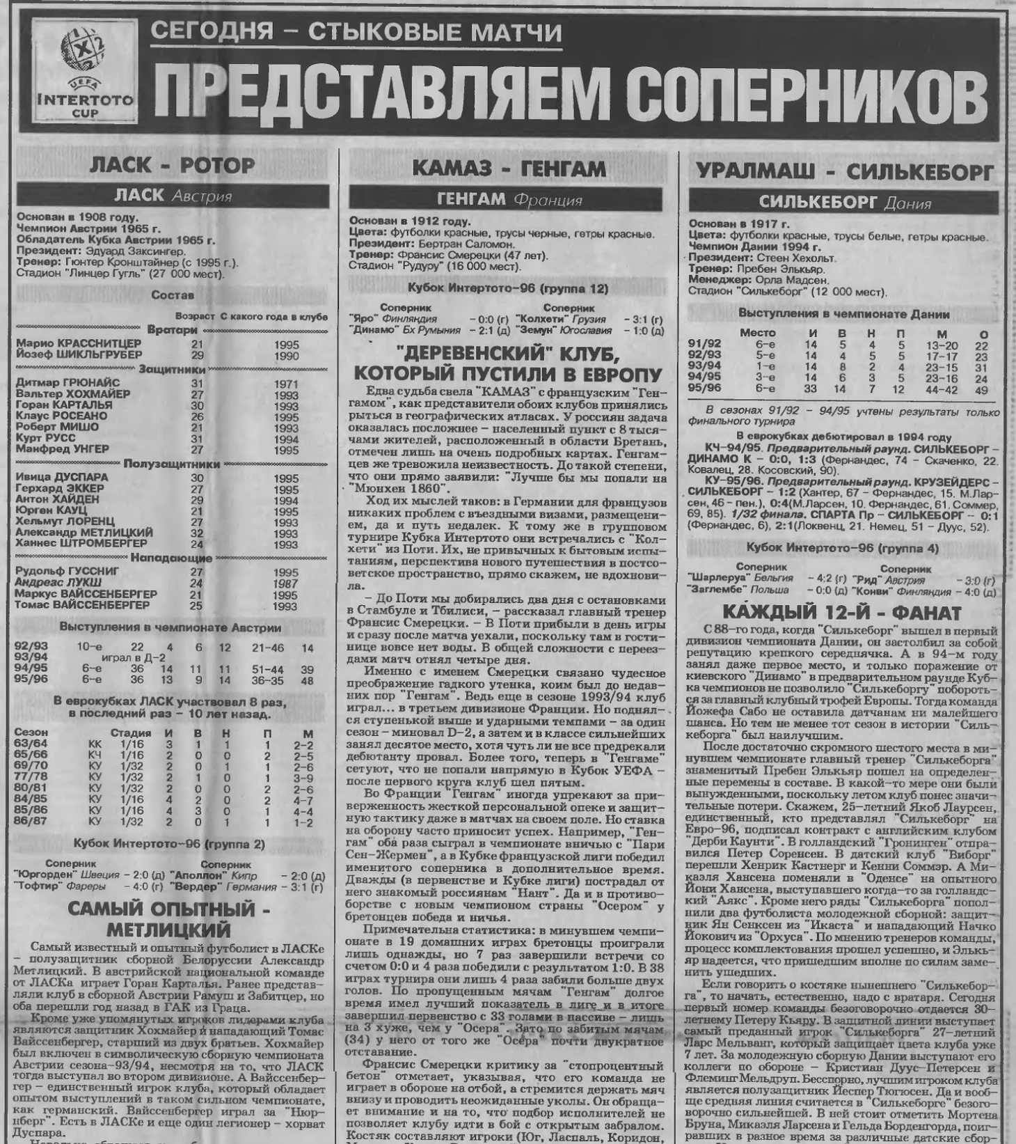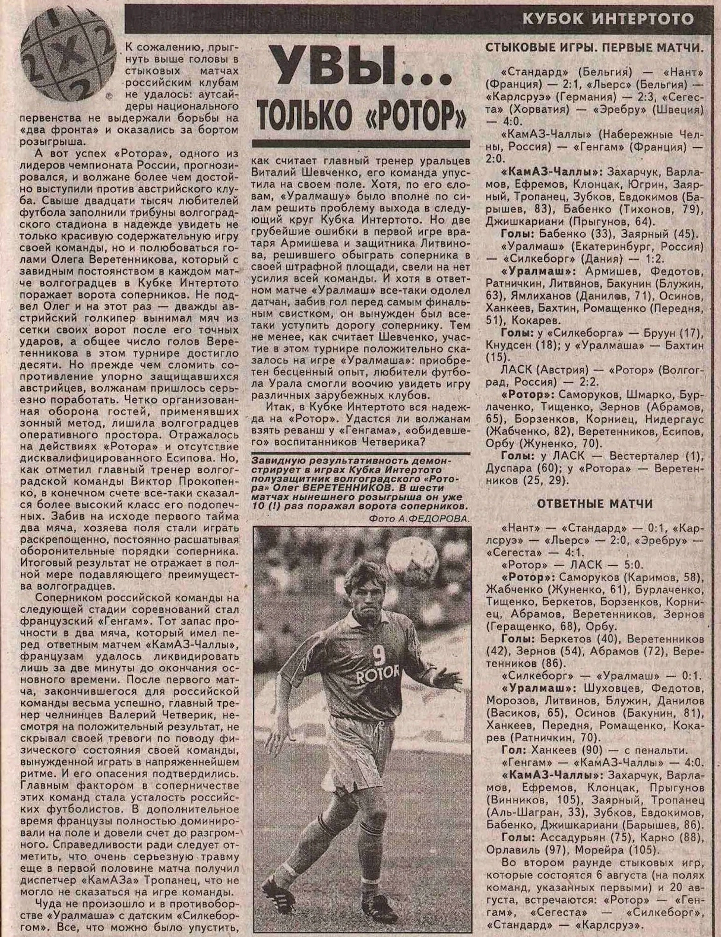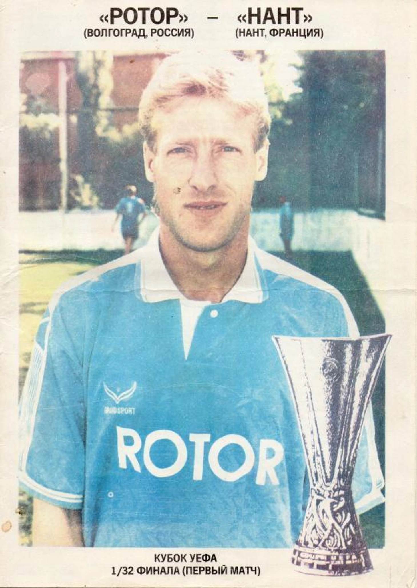 1994 ГОД По итогам чемпионата 1993 года "Ротор" удостоился играть в Кубке УЕФА. Клубу в 1-ом раунде достался французский "Нант". Не фартануло, не сложилось. Волгоградцы хоть и победили дома 3:2, но уже во Франции счет было в пользу хозяев. 2 безответных мяча "Нанта" вывел их во 2-ой раунд