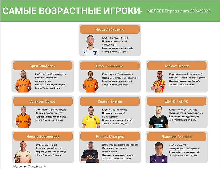Топ-10 самых возрастных игроков, игравших в МЕЛБЕТ Первой лиге сезона-2024/2025