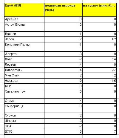 Итого: клубы АПЛ подписали 34 игрока на общую сумму около £130 млн., т.е. в среднем £3,8 млн. за трансфер