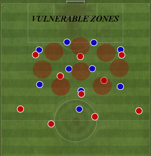 У каждого инструмента обороны есть очевидные минусы, которыми грамотные команды всегда пользуются – так если игроки используют высокий прессинг в оборонительной фазе, то возникают свободные зоны сразу после блока прессингующих: