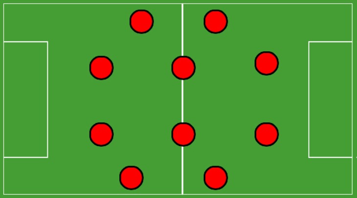 Каждый полевой игрок должен контролировать 600 квадратных метров, или зоны поля около 25 х 25м (если брать квадрат, как геометрическую фигуру, наиболее удобную для распределения зон ответственности футболистов).