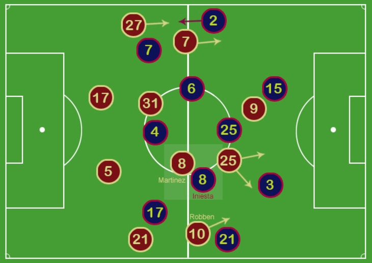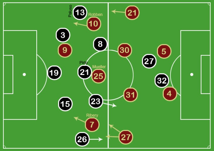 Часто «Бавария» мгновенно включала высокий прессинг в момент, когда вратарь соперника получал мяч, тем самым ограничивая варианты «короткого» розыгрыша мяча, а выдвигающиеся высоко защитники немцев заставляли форвардов противника возвращаться за линию центра поля, создавая сверхплотность на чужой половине поля. В такой насыщенной игроками зоне, когда 21 человек располагаются на площади 50*60 м, баварцы использовали персональную опеку соперника.