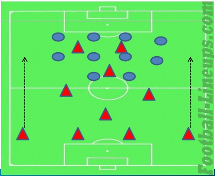 Если же применяется низкий прессинг (как это практикует Моуринью во многих играх «Челси»), и линия обороны опускается, это дает возможность сопернику владеть мячом и спокойно искать пути для вскрытия защиты: