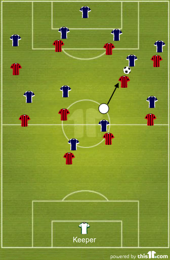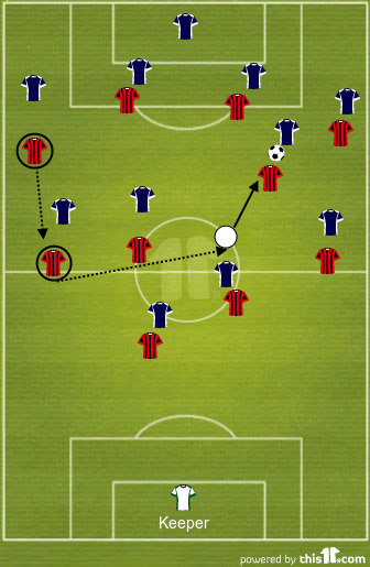 В эти зоны мгновенно доставляется мяч, дестабилизируя построение, как это часто происходит, когда прессингуют «Барселону». Только запредельно энергичный высокий прессинг игроками высокого класса может создать проблемы каталонцам, как это делал Моуринью в «Реале»: