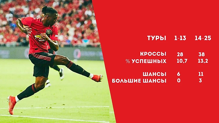 В сравнении с началом сезона Ван-Биссака стал значительно больше кроссить, хотя до Александра-Арнольда еще и далеко. Примерно как Сульшеру до Клоппа. Рост успешных навесов на уровне статистической погрешности, но будем верить. При этом нельзя игнорировать значительный прирост количества передач под удар и созданных больших шансов. За вторую половину сезона АВБ отдал в два раза больше ключевых передач (кстати, смело плюсуйте сюда голевую в матче с Челси. Текст начал писаться до него), чем за первую, и создал 3 больших шанса (шансы, с кторых легче забить,чем нет) против 0.