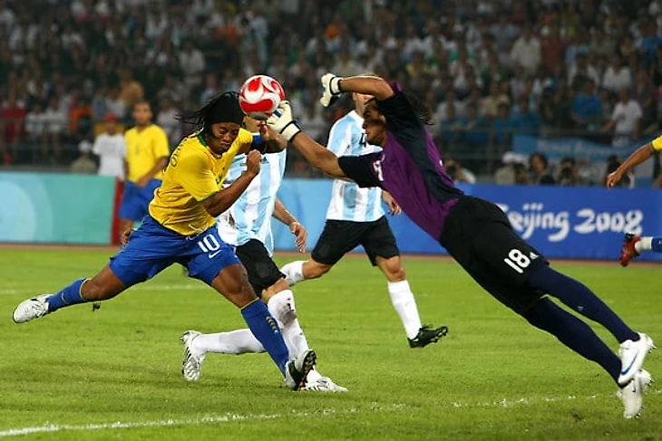 Ромеро эффектно выбивает мяч с головы Рональдиньо на Олимпиаде 2008