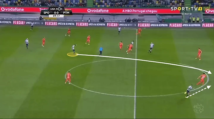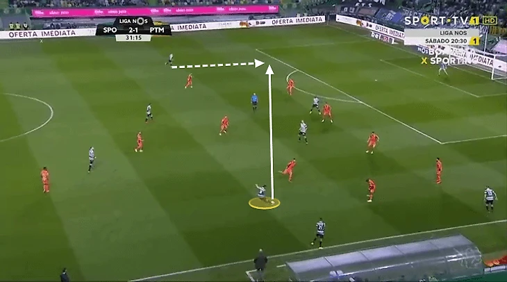 Ко всему прочему, с Фернандешем на поле игра «Манчестер Юнайтед» с мячом выйдет на новый уровень. Погба, будучи в форме, является фантастическим распасовщиком, но другие полузащитники «Юнайтед» часто подобным похвастаться не могут. Подписание Фернандеша помогло бы «Юнайтед» ускорить игру в пас, чтобы атаковать соперника быстрее. На кадре ниже можно заметить, как Фернандеш определяет слабую зону в обороне «Портимоненси», а затем совершает кросс через всё поле на набегающего партнёра.