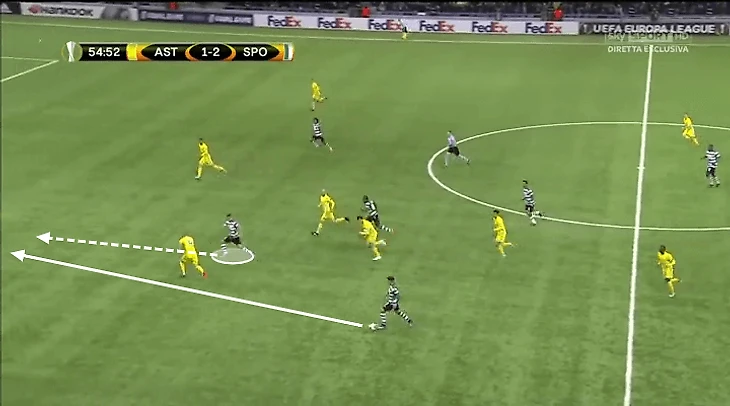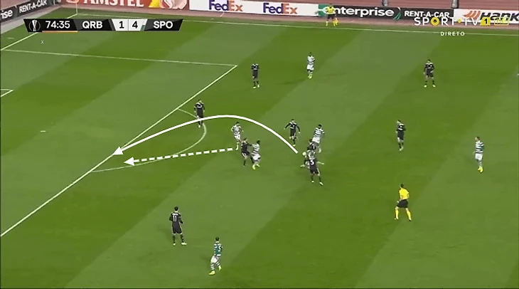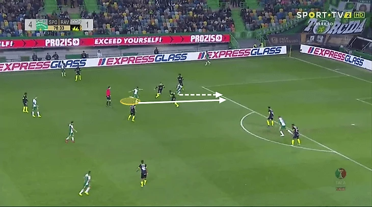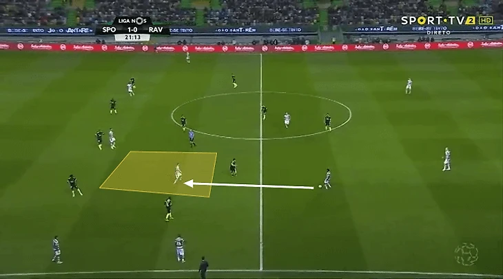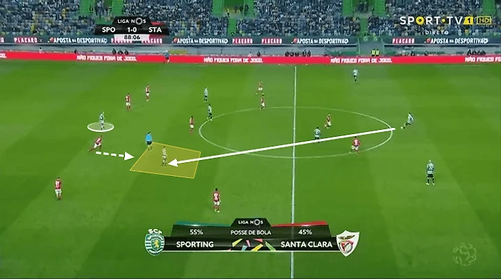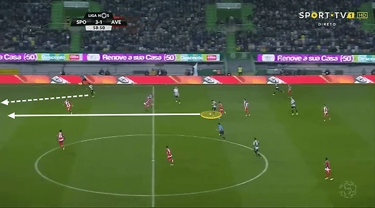 На следующем кадре можно заметить уже другой тип рывка. Здесь «Спортинг» исполняет сложные перепасовки вне штрафной. Так как одного центрального защитника на себя стянул нападающий, Фернандеш пользуется моментом и забегает за спины защитникам. После чего он получает пас и забивает. Если ему выдастся играть с Погба и Лингардом, то его умение совершать подобные забеги в правильный момент сделают «Юнайтед» очень опасной командой.