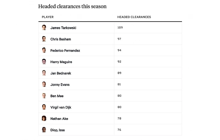 Из 50 игроков с наибольшим количеством верховых побед в этом сезоне только Ван Дейк и Чаглар Сеюнджу имеют лучшую точность передач на половине поля соперника. Ван Дейк занимает восьмое место по количеству побед в верховых единоборствах (80) и завершил 80,62% из 1223 попыток пасов. Сеюнджу занимает 14-ю позицию при 73 побед в верховой борьбе, а завершил 84,59% пасов из 772 попыток.
