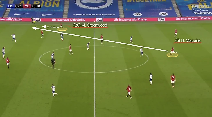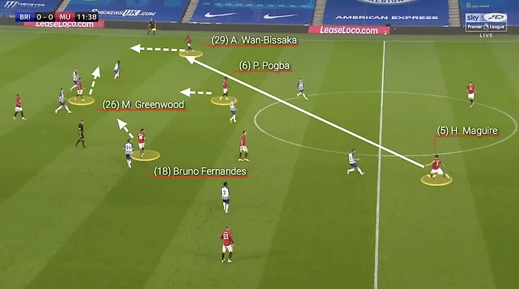 В игре с «Брайтоном» результат даже улучшился. Магуайр действовал быстро, чтобы забрать мяч у Шоу, выдав еще одну диагональ на Уан-Биссаку, который находился на открытом фланговом пространстве. Полузащита «Юнайтед» ожила.