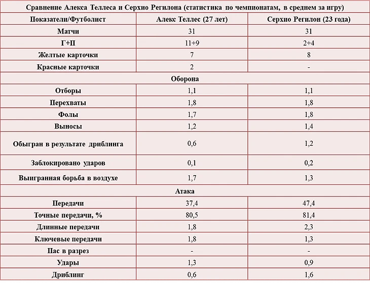 Показатели испанца и бразильца более-менее равномерные, ни у кого из них нет особого преимущества. Алекс Теллес лучше противостоит дриблингу (0,6 против 1,2) и увереннее действует на втором этаже (1,7 на 1,3), в свою очередь Серхио Регилон чаще использует длинные передачи (2,3 против 1,8) и активнее идет в дриблинг (1,6 против 0,6).