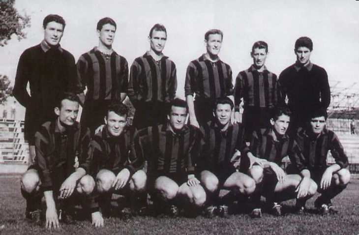Чемпионы Италии — 1959. «Красный дьявол из Авальянеды» внизу , третий слева в окружении Альтафини и Дановы