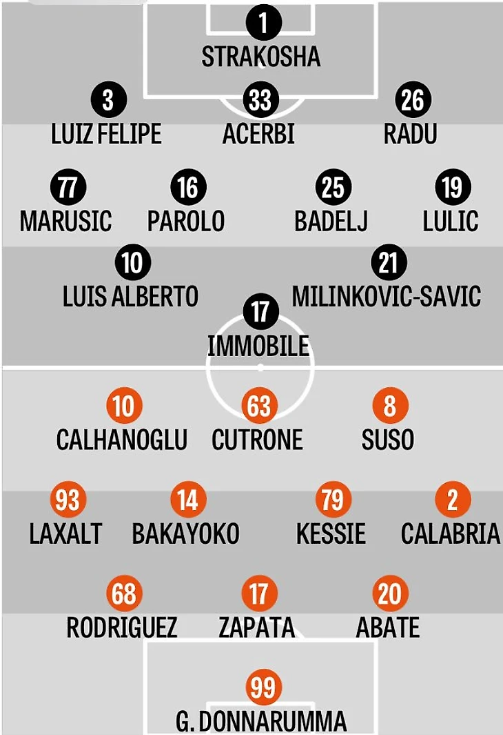 Ориентировочные составы на матч против римлян и миланцев от La Gazzetta dello Sport. Самый опытный в этом варианте одиннадцати "стартовых" от Гаттузо - воспитанник клуба Иньяцио Абате, на его счету 281 игра итальянской Серии А.