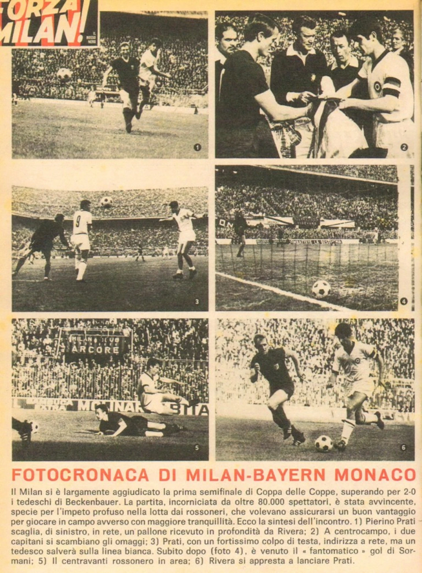 8 мая 1968 года красно-чёрные в Мюнхене сыграли с немцами в ничью и пробились в финал турнира, прошедшего в Роттердаме на стадионе местного «Фейеноорда». Состав не претерпел изменений в выездной схватке, а голкипер миланцев Карло Кудичини вновь сохранил свои ворота на замке, чем несомненно порадовал своего алленаторе , неподражаемого тактика синьора Нерео Рокко.