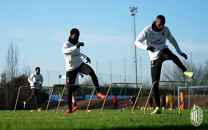 Новички "Милана" Лерой Абанда и воспитанник лиссабонского "Спортинга" Тьяго Джало на тренировке в Миланелло. 4 февраля.