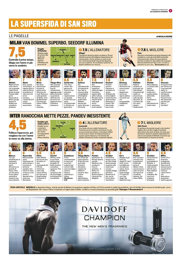 Чёрно-синие сменили тренера по ходу турнира, Леонардо вдохновил команду на мощный рывок, и клуб выдал впечатляющую серию, набрав много баллов после провала в первой половине гонки. "Милан" перед столкновением на "Сан-Сиро" понёс потери, проиграв на Сицилии с минимальным счётом. Не мог штаб Аллегри рассчитывать и на шведского бомбардира Ибрагимовича, тот отбывал дисквалификацию после удаления, полученного 13 марта в поединке с "Бари". Выступить главной примой матча у красно-чёрных должен был Алешандре Пато , помочь бразильцу в атаке должен был соотечественник Робиньо. Пато к апрелю 2011 года уже забил одиннадцать голов в Серии А, Робиньо на один мяч меньше.