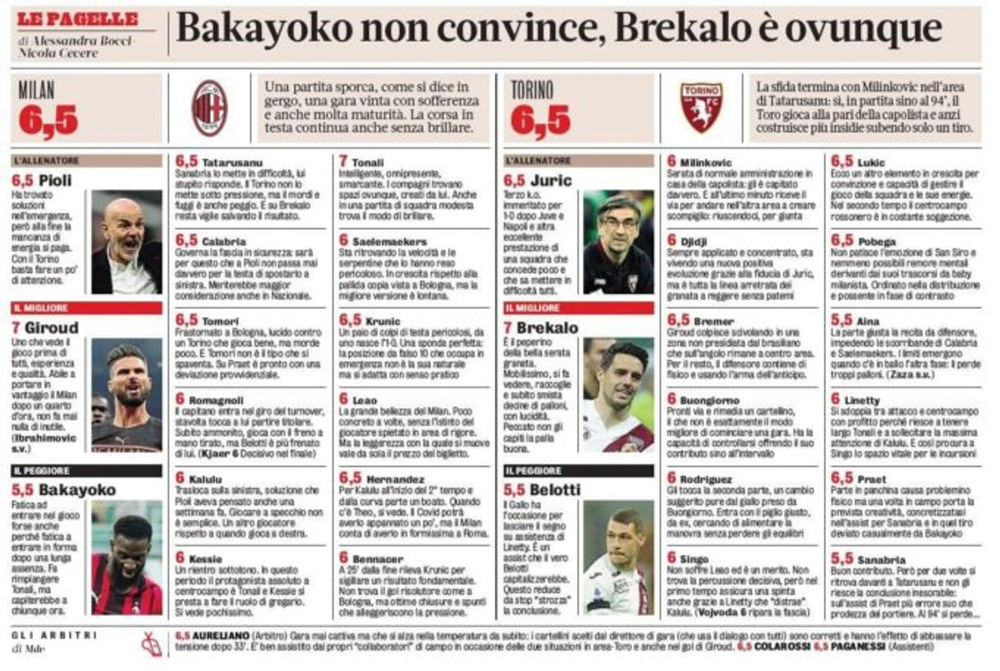 Напомню: мастерский трёхочковый занос мяча в ворота, совершённый чемпионом мира в борьбе с капитаном туринцев Белотти, состоялся после отличной скидки на дальнюю штангу в исполнении Раде Крунича, который блестяще воспользовался подачей с угловой отметки именно Сандро Тонали. Milan News.it , оценивший Тонали теми же семью баллами, так описал действия воспитанника "Брешии": "Играл с уверенностью ветерана. Он не пропускал мячи, много подчищал, контролировал действия, даже когда его товарищи по команде повышали уровень сложности в управлении мячом. Побеждал множество раз в ярких эпизодах и выходил из трудных ситуаций под овациями "Сан-Сиро"."