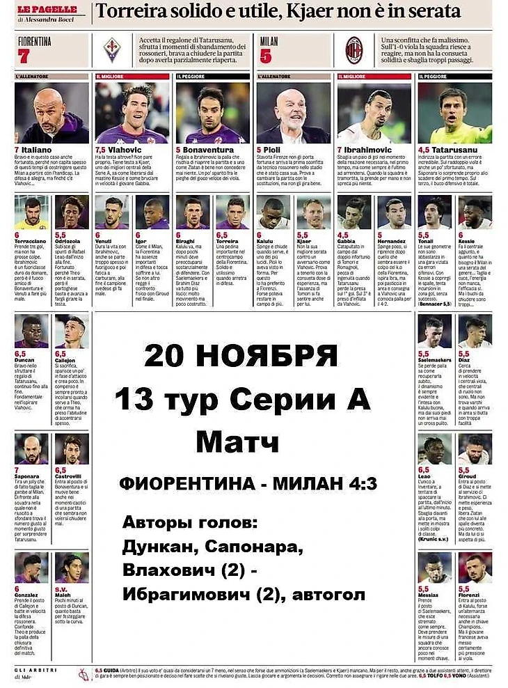 Достойно отстоял в воротах румынский вратарь Чиприан Тэтэрушану , восстановивший реноме после технической ошибки на "Артемио Франки" в последнем поединке Серии А. Голкипер получил разгромные отзывы, и даже лояльный ресурс Milan News.it выставил ужасный балл - четвёрку за игру против "Фиорентины", Влаховича и Тео Эрнандеса.