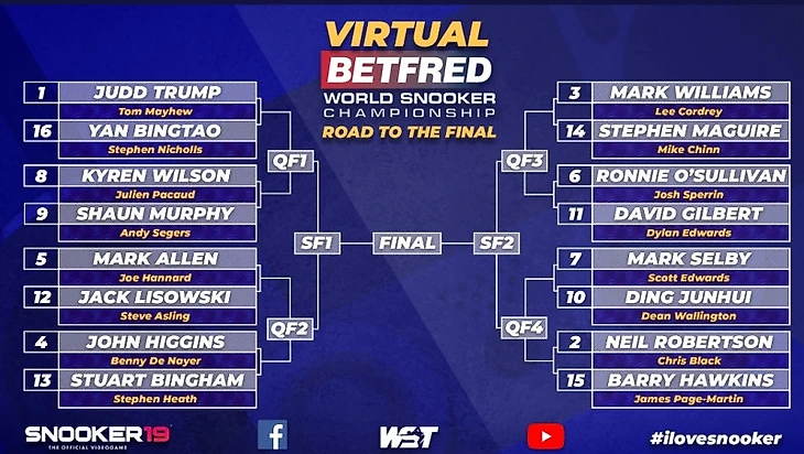 Снукер, как и весь спортивный мир находится в карантине. Самое главное событие - Чемпионат мира по снукеру 2020 перенесен на лето- предварительно по 32 июля - 16 августа. Тем временем WST ( Всемирный снукерный тур) решил провести первый в своем роде виртуальный чемпионат. Были выбраны 16 игроков в Snooker 19( игра на Play station 4), которые представили топ 16 мирового рейтинга.