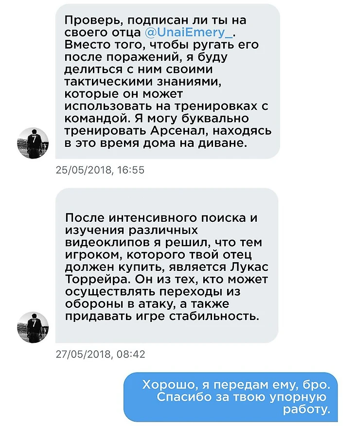 После этого пользователи твиттера стали засыпать забавными сообщениями "псевдосына" Эмери. Эта была самая забавная переписка, фанат реально поверил, что может помочь осуществить несколько трансферов для "Арсенала".