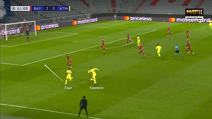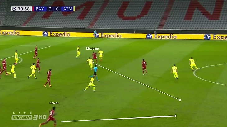 Когда игроки Баварии начали больше играть в центре поля и там контролировать мяч, тогда у Атлетико был шанс перевести игру на фланги, но они этого не делали. Лишь иногда появлялась возможность убежать по флангу, и тогда под передачу должен был открываться крайний защитник, но и это происходило редко, а если и происходило, то максимум, что Матрасники извлекали из этого - угловой.