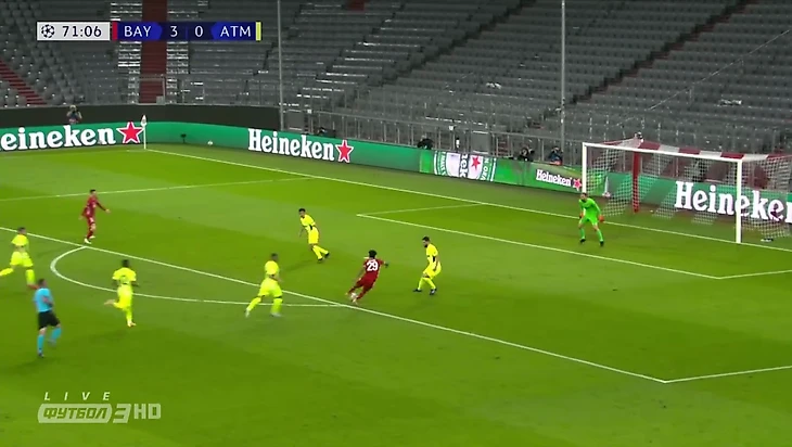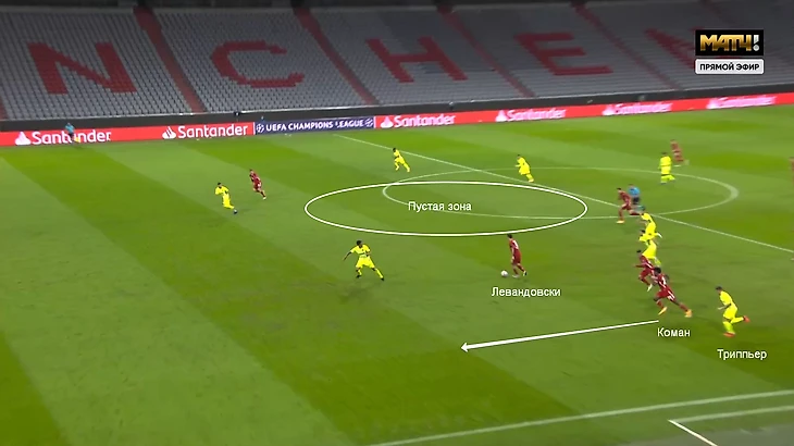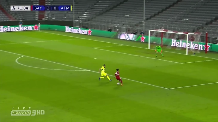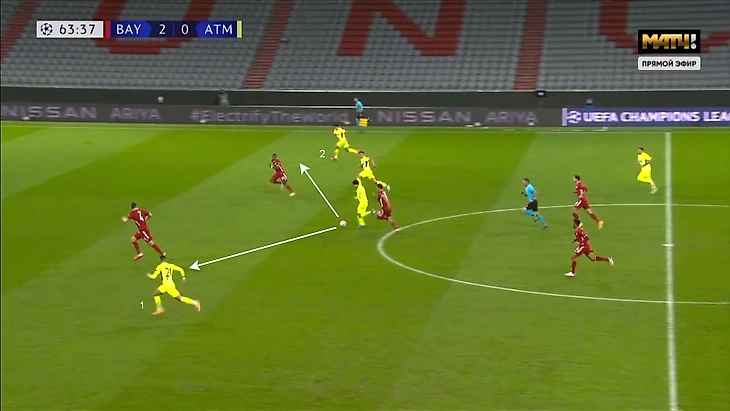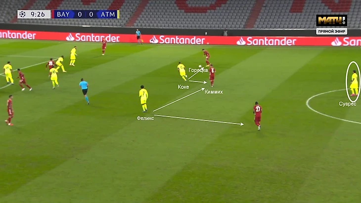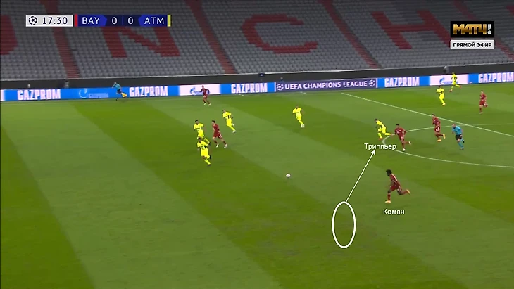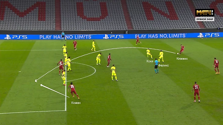 В этой атаке Коке и Феликс снова не встречают игрока с мячом, он может спокойно поднять голову, у него есть несколько секунд на подготовку к передаче и прекрасная возможность ее исполнить, против Киммиха так нельзя. Ну, а Триппьер не сыграл плотно и пропустил Комана за спину. Коман оказался перед воротами и забил первый гол в матче.
