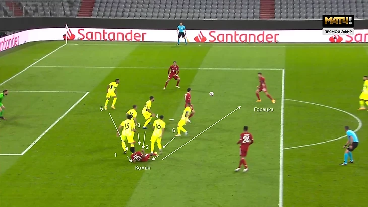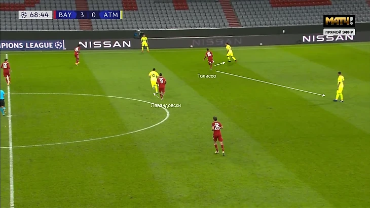 В прессинге Баварии почти всегда участвовало 2 человека - это Левандовски и Толиссо. Если Толиссо шел прессинговать защитника, который с мячом, то Левандовски накрывал полузащитника, через которого команда выходит из обороны, и то же самое наоборот.