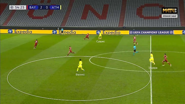 Во второй голевой атаке Мюнхенцев было четко видно, что центр поля Атлетико сегодня плох. Да, мяч был перехвачен, но все равно в центре поля должны быть люди, он не должен так пустовать, ведь в любой момент мяч может быть перехвачен. Кроме того нужно выходить из обороны, у команды должно быть несколько вариантов, а когда центр поля пуст, тогда выходить из обороны намного сложнее, поэтому и произошел перехват.
