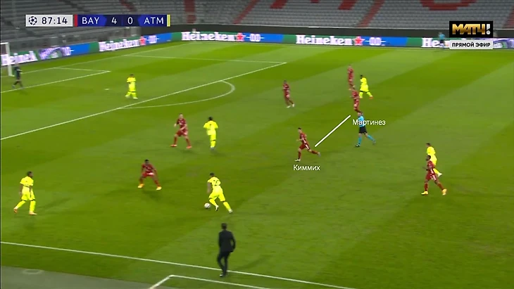 Я уже много раз показал, как ужасно действовал Атлетико во время потери мяча, а здесь покажу пример того, как действовала Бавария после потери мяча. Атлетико пытался всей командой отойти назад, а если полузащитников нет, то никто не выдвигался встречать соперника в центре поля. Ну, а Бавария играет в таких случаях иначе, вы видите на скриншоте, что Киммих и Мартинез сразу перекрыли центр поля, чтобы атака не пошла через него, это гораздо лучше, чем то, что делали Матрасники.